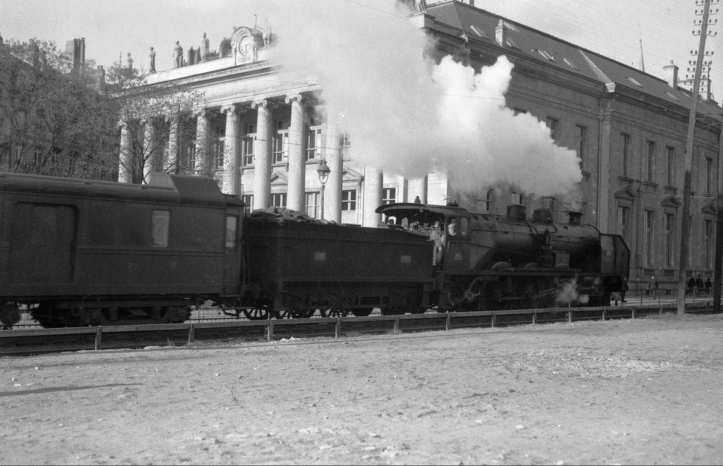 Le train passe devant la Bourse