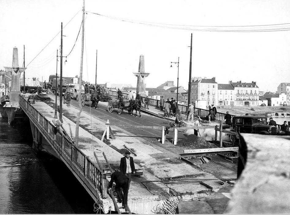 Pont de la Madeleine. Vue de la circulation sur la pont détruit et des travaux de réparation