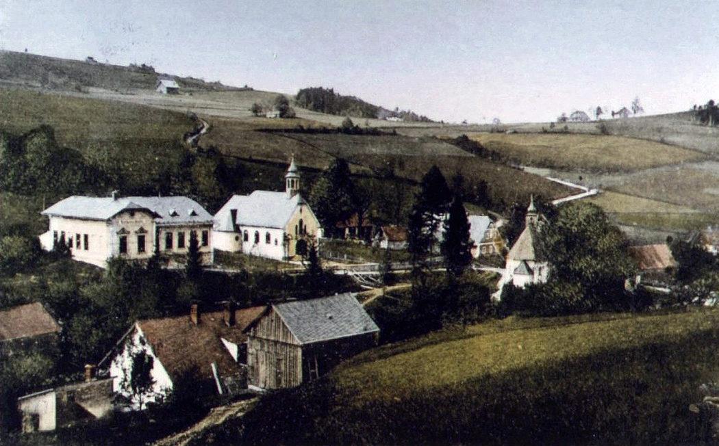 Dolní Údolí, kostel sv. Acháce, celkový pohled na původní (vpravo) a nový (vlevo) kostel