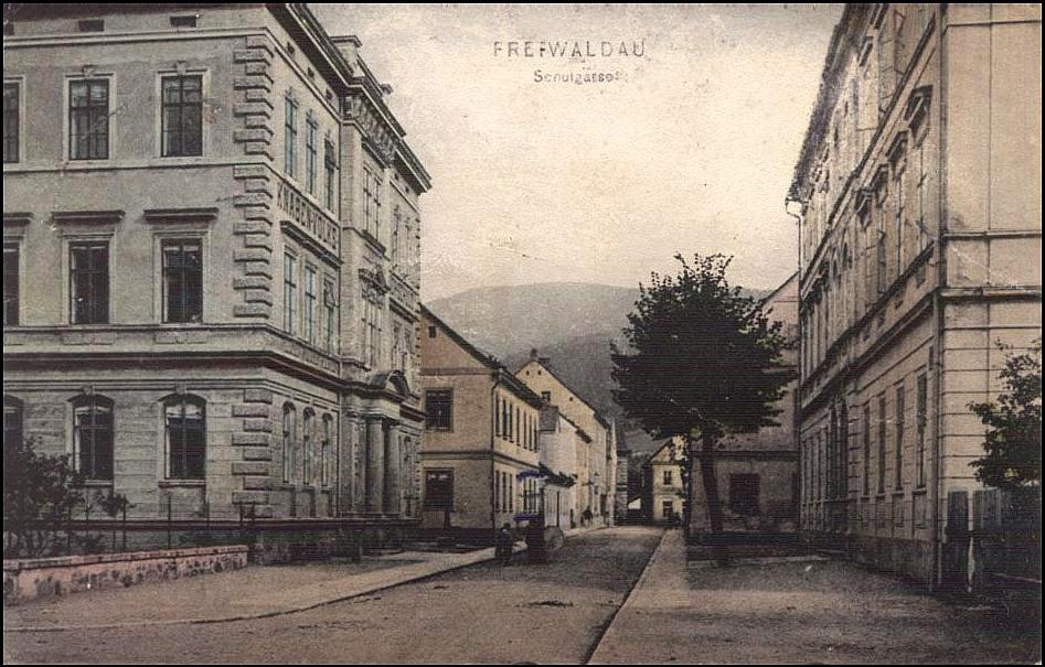Jeseník, Komenského, Pohled Školní ulicí s dnešními budovami gymnázia a ZŠ