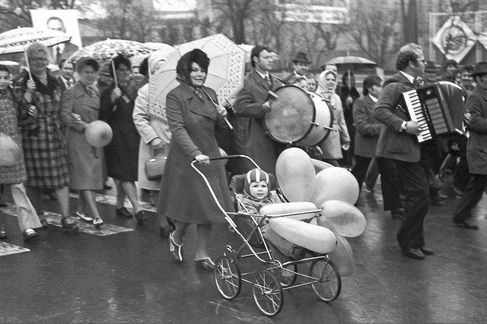 Молодой демонстрант на праздничном шествии на площади Ленина