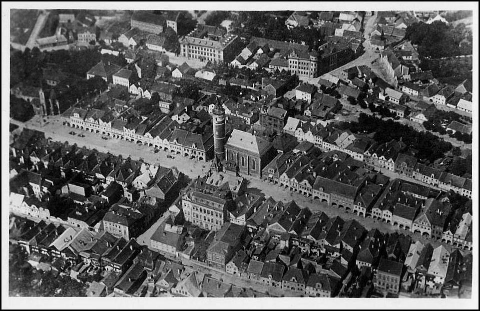 Domažlice. Letecký pohled na náměstí a jeho okolí.