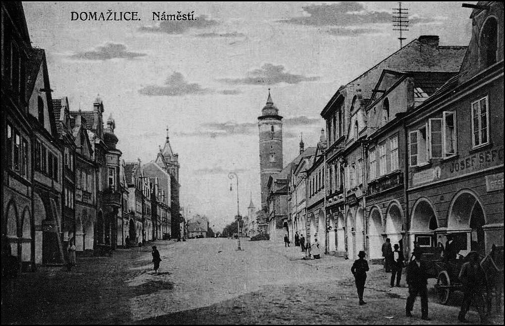 Domažlice. Pohled náměstím k věži kostela