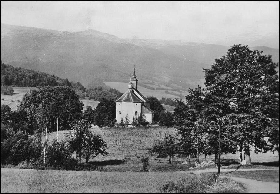 Zelená Lhota. Kostel sv. Volfganga a v pozadí hora Ostrý