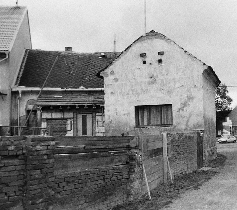 Město Touškov, východní strana synagogy (vlevo) s domkem židovské obce