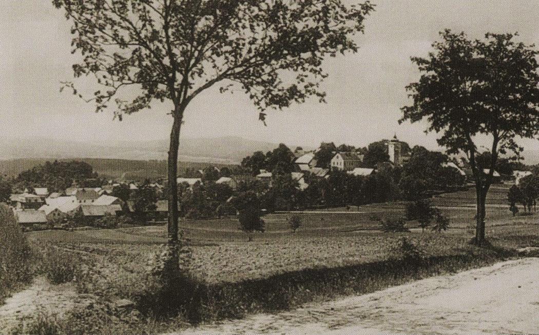 Nová Ves, kostel sv. Linharta, celkový pohled na obec s kostelem