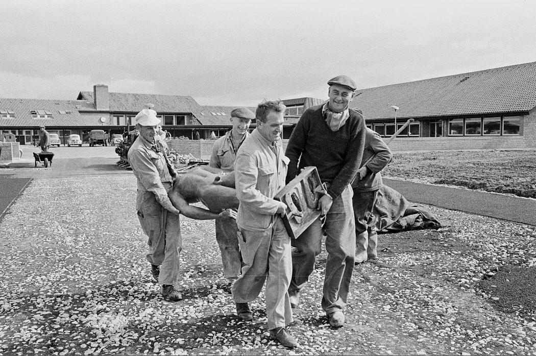 Carl Nielsen Skolen. Statue bæres på plads, til indvielsen