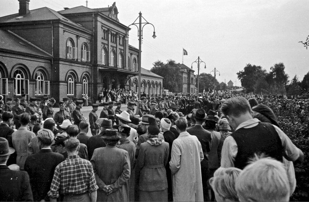 Menneskemængde foran banegården i Nyborg