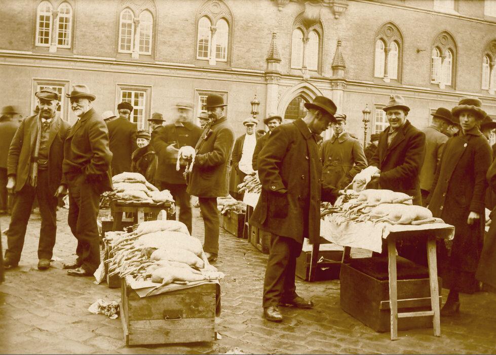 Torvehandel på Flakhaven foran Rådhuset. Fjerkræ