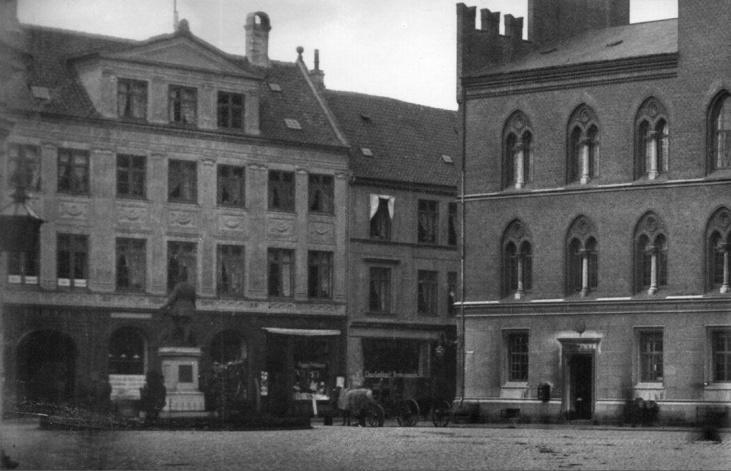 Flakhaven med statue og hjørnet af rådhuset. Vestergade11, Bryggergården