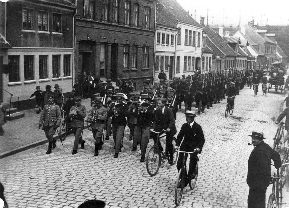 Sankt Jørgens Gade. Militært optog med regimentsmusik i spidsen