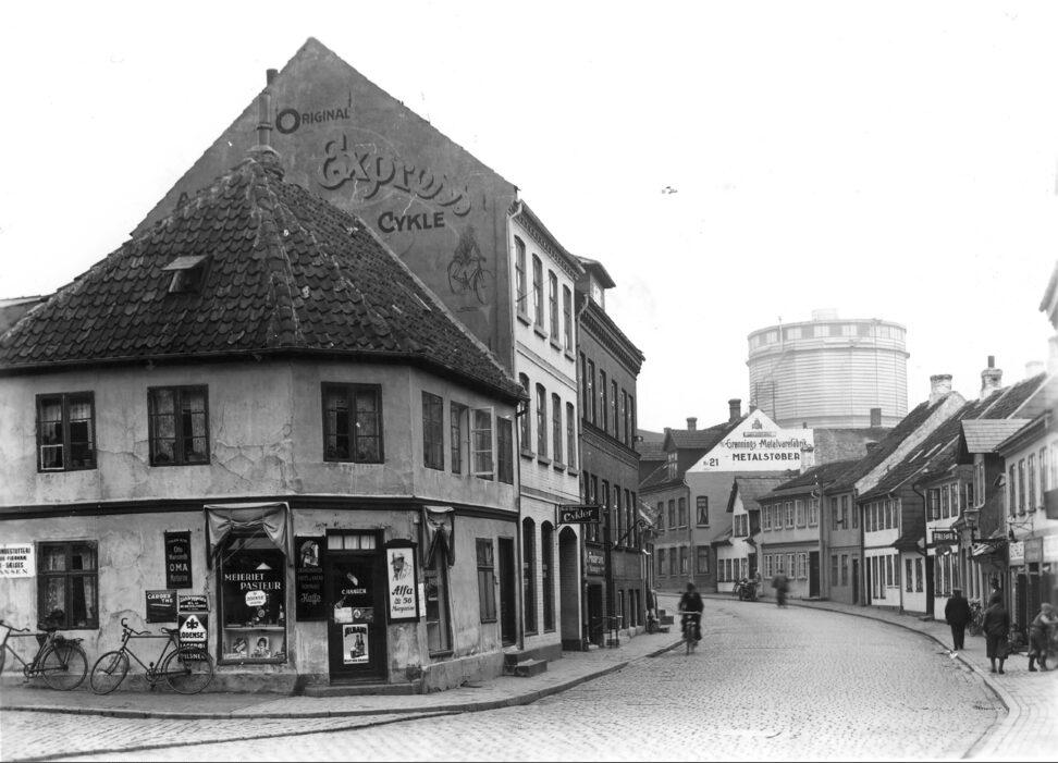 Sankt Jørgens Gade ved hjørnet af Pjentedamsgade. I baggrunden gastårnet