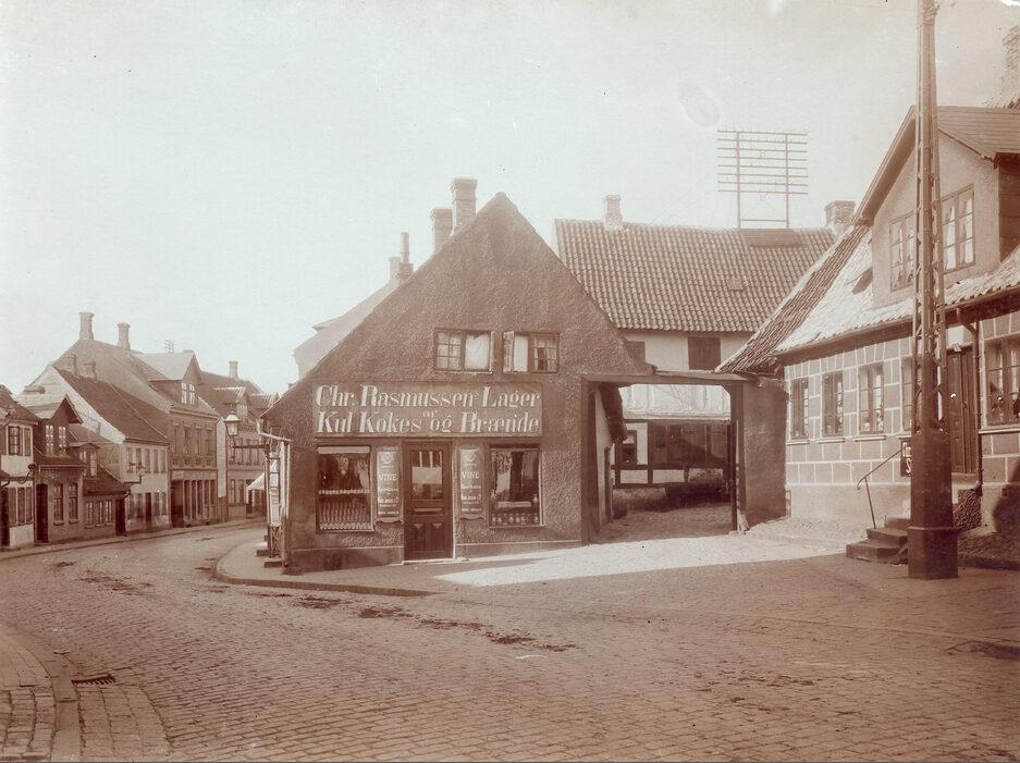Christian R. Rasmussens Købmandshandel i Sankt Jørgens Gade nr. 12, set fra øst. Til højre ses nr. 14