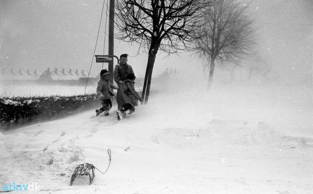 Børn leger i snevejr ved Skovgyden