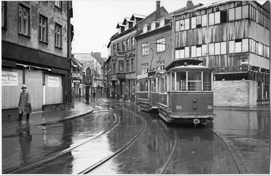 Nørregade. Sprovogn i regnvejr