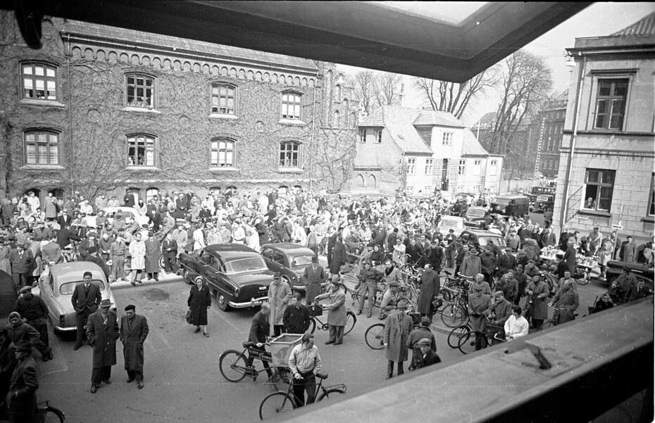Folkemængde hører nyhedsoplæsning, Gråbrødre Plads