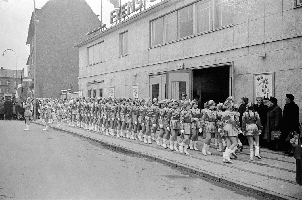 Sortebrødre Torv. Odense Pigegarde foran Fyens Forum