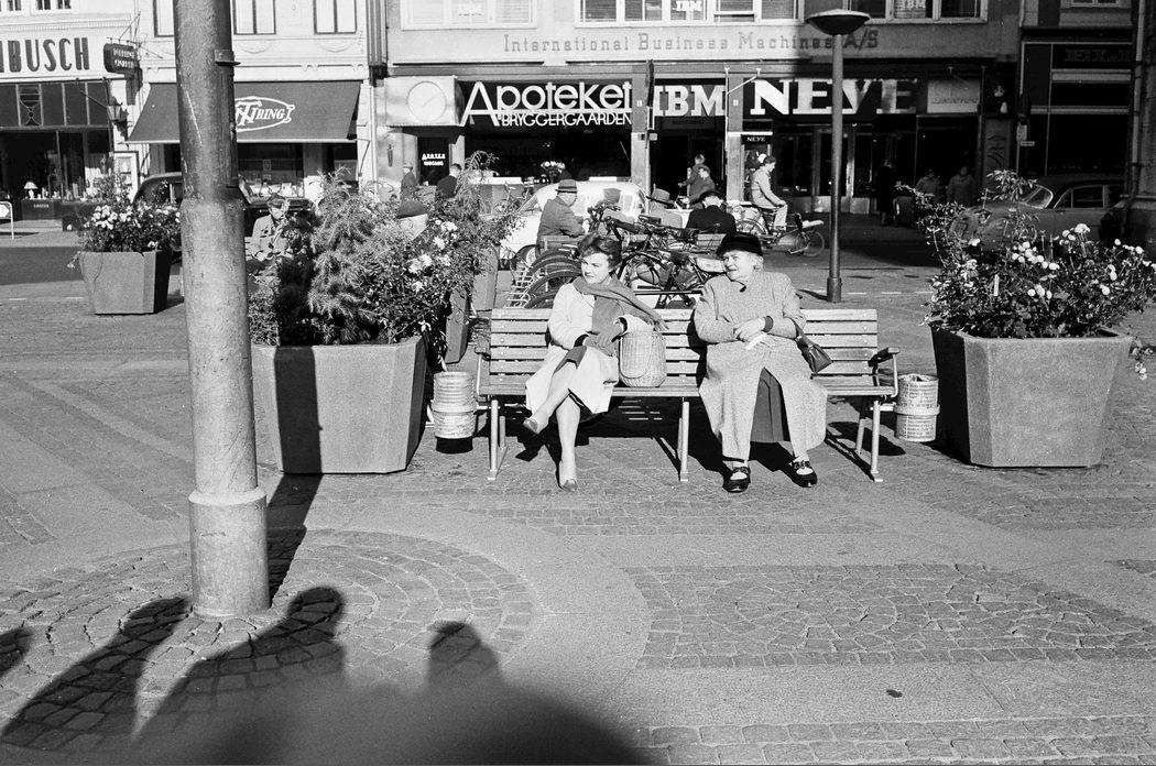 Flakhaven. Damer slapper af på en bænk foran Rådhuset