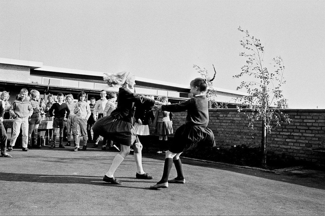 Skt. Klemensskolen, indvielse. Børn leger på græsplænen