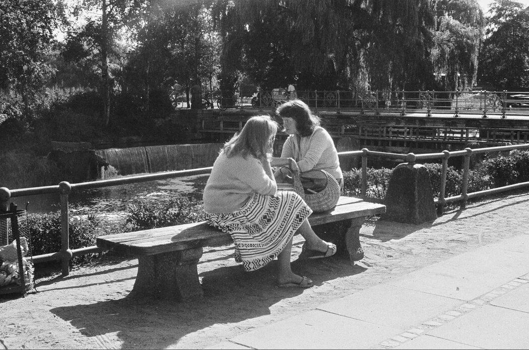 Filosofgangen. To kvinder på en bænk ved Odense Å
