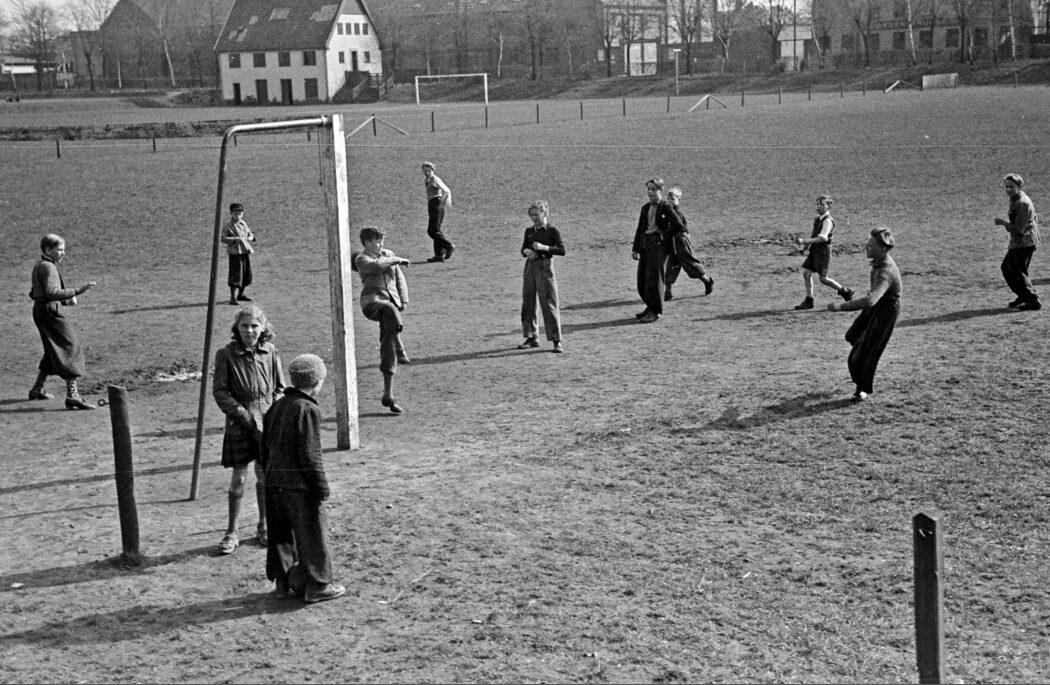 Heltzensgade. Drenge leger på fodboldbane