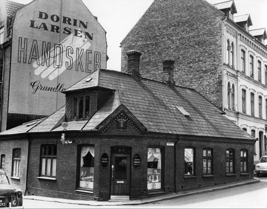 Dorin Larsens handskeforretning på hjørnet af Horsetorvet og Munkemøllestræde