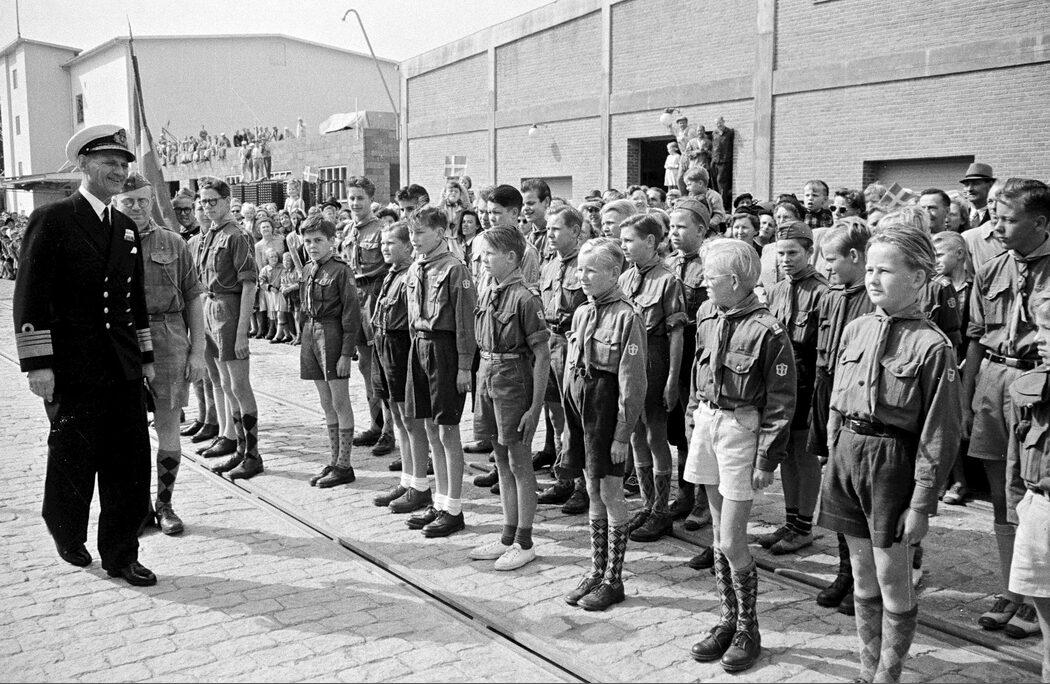 Kong Frederik IX og spejdere i Odense Havn