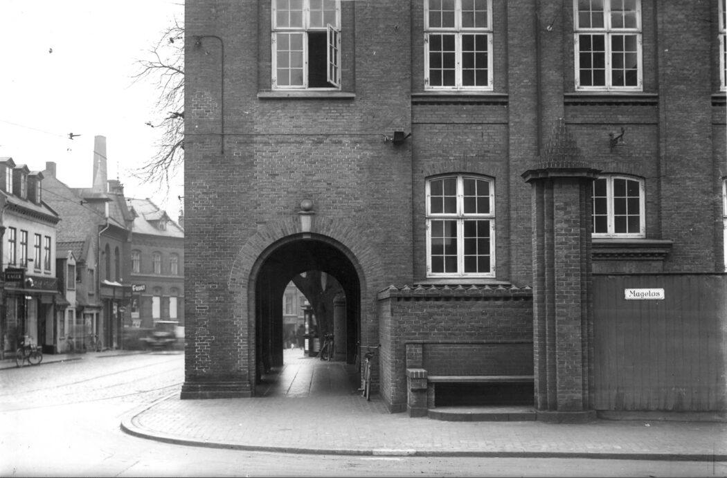 Klaregade 15, hjørnet ved Mageløs. Klaregade Skole, buegangen