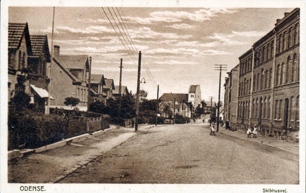 Skibhusvej. I baggrunden ses Fredens Kirke