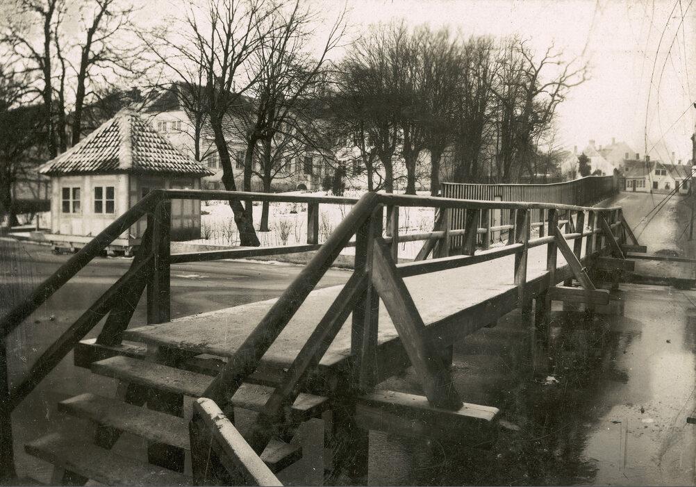 Klaregadebro, træbro. Til venstre Bispens lysthus ved Åen og i baggrunden Bispegården