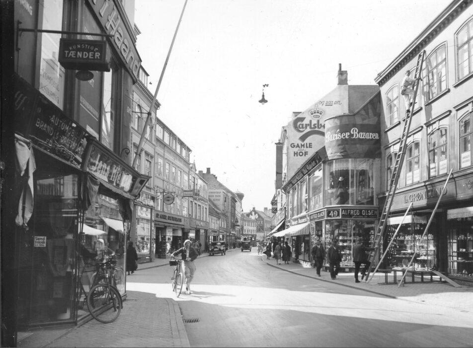 Vestergade set mod vest, fra nr. 48 og 47. Til venstre Smedestræde