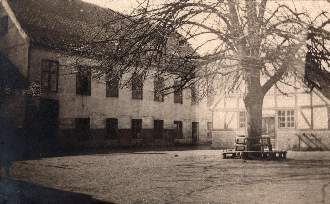 Skolegården, Søndergade 5, Giersings Skole. Bygningen til højre rummede gymnastiksal