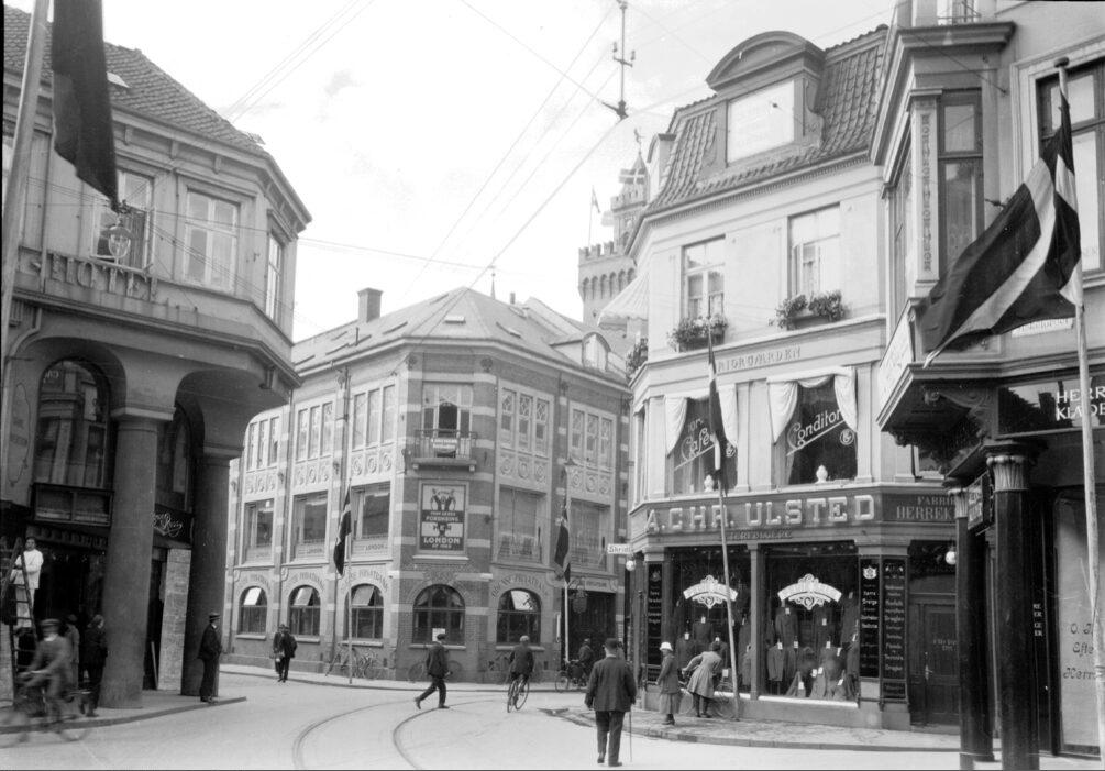 Korsgade, Vestergade, Skomagerstræde, Overgade. Ulsteds hjørne. Brockmanns hjørne