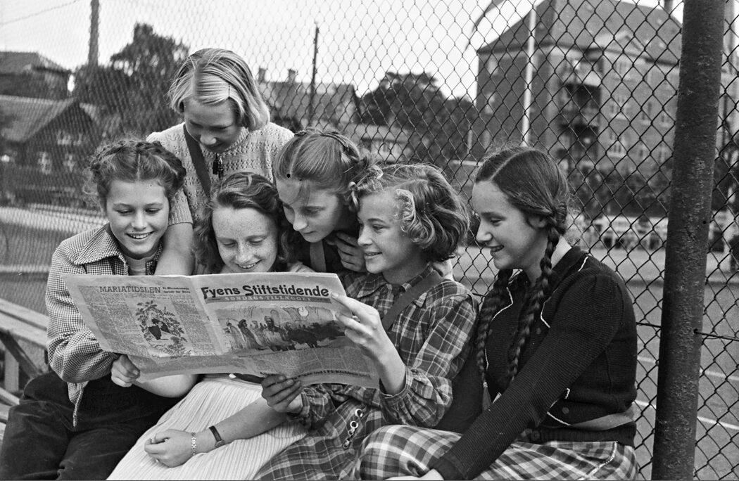 En flok piger læser Fyens Stiftstidende foran tennisbanerne på Allégade