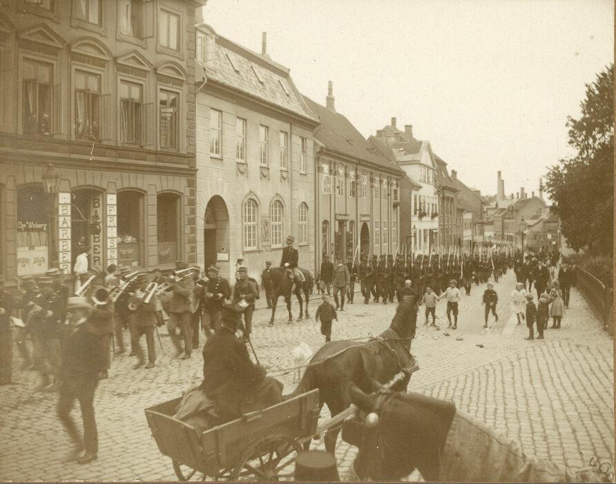 Militærorkester og soldater i Overgade
