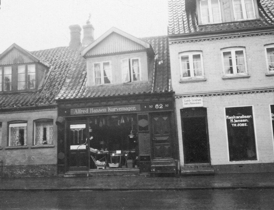 Huse på Nørrebro, med butikker. I midten "Alfred Hansen Kurvemager"
