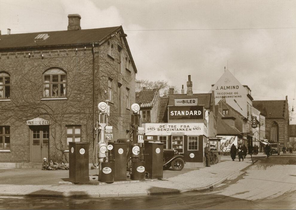 Hjørnet af Nørregade og Asylgade, på hjørnet en benzintank