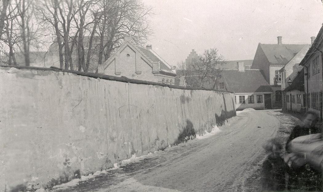Asylgade. Til venstre den gamle hospitalsmur