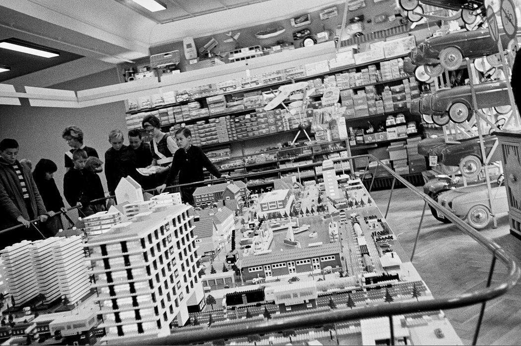 Børn i Stormagasin Victory Legetøj. By af legeklodser