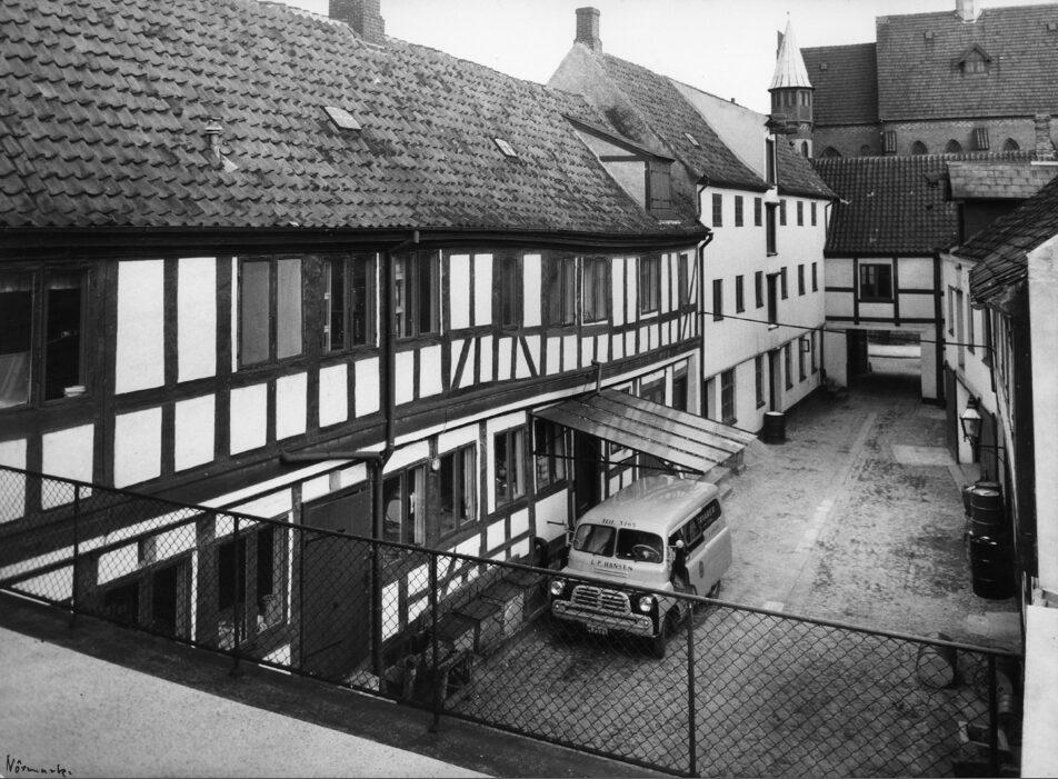 Overgade 13. Baggården. Adelgade med den katolske kirke i baggrunden