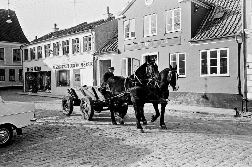Torvet. En hestevogn med 2 heste foran på vej gennem Ærøskøbing med et læs kalk