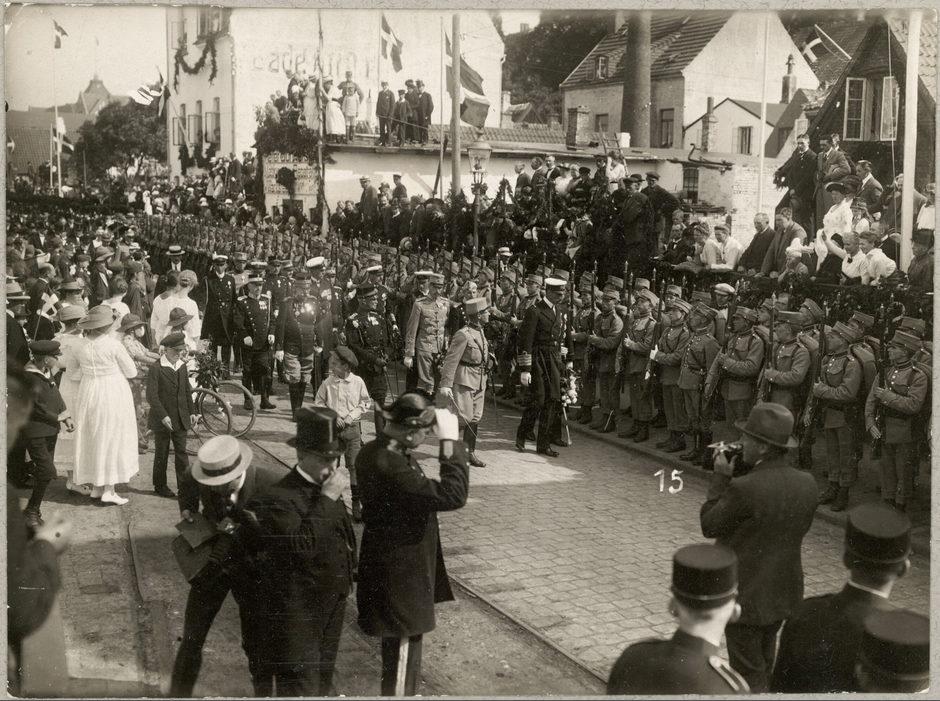 Christian X inspicerer de danske soldater efter ankomst til Sønderborg med Dannebrog