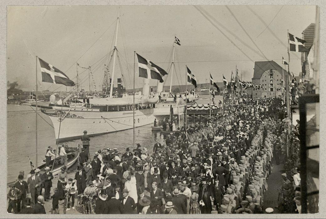 Kongeskibet Dannebrog ved kaj i Sønderborg under kongefamiliens besøg i Sønderjylland efter Genforeningen