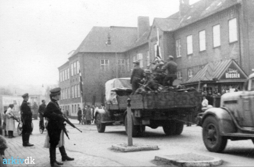 Vejle. Tyske militærkøretøjer på Dæmningen