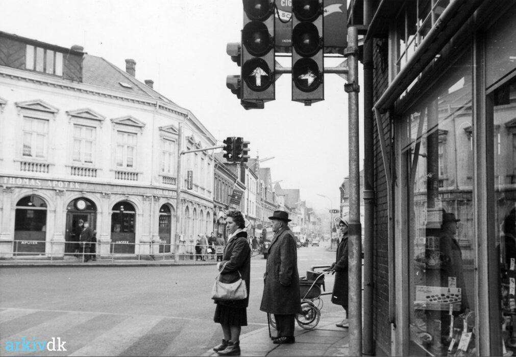 Vejle. Fodgængere venter på hjørnet af Dæmningen og Nørretorv