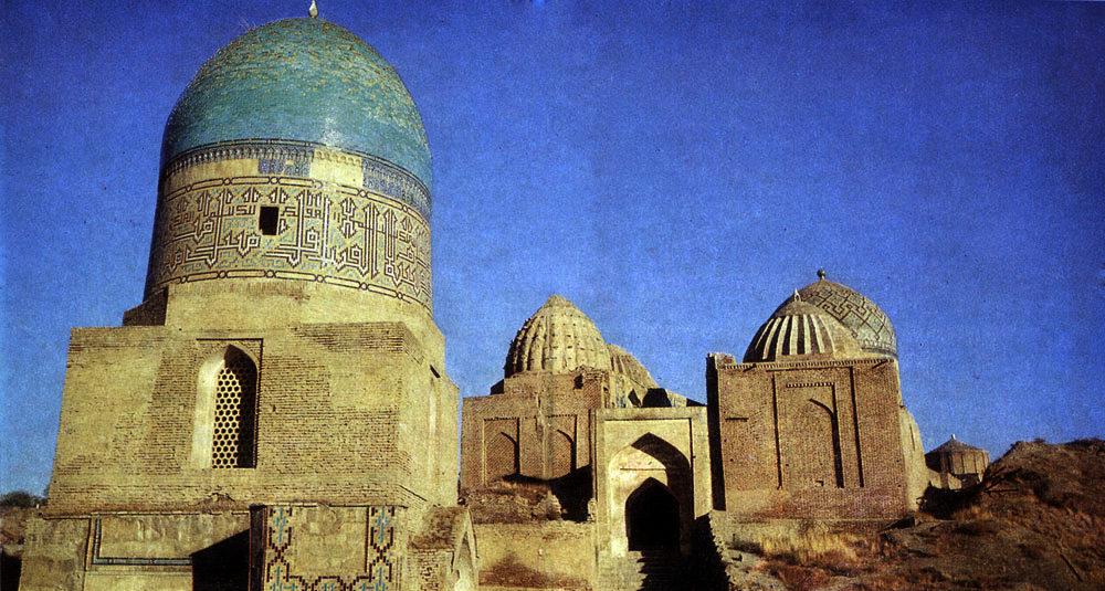 Шахи-Зинда. Двухкупольная усыпальница "нижней группы" и мавзолей XIV в. на гребне стены
