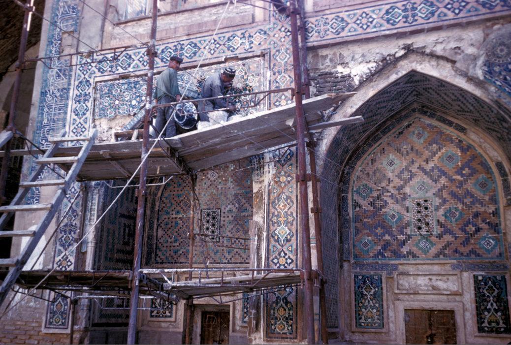 Реставрация мозаичной облицовки во дворе медресе Улугбека