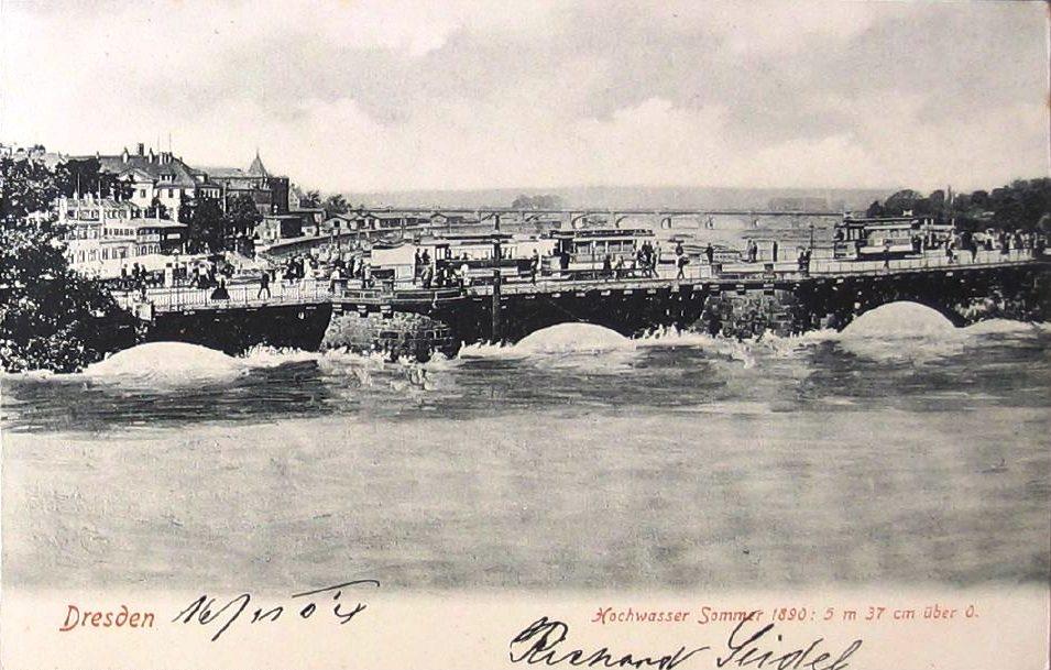 Ansichtskarte der Augustusbrücke mit dem Wasserstand der Elbe im Sommer 1890