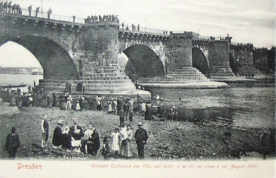 Ansichtskarte der Augustusbrücke mit dem Wasserstand der Elbe im August 1904