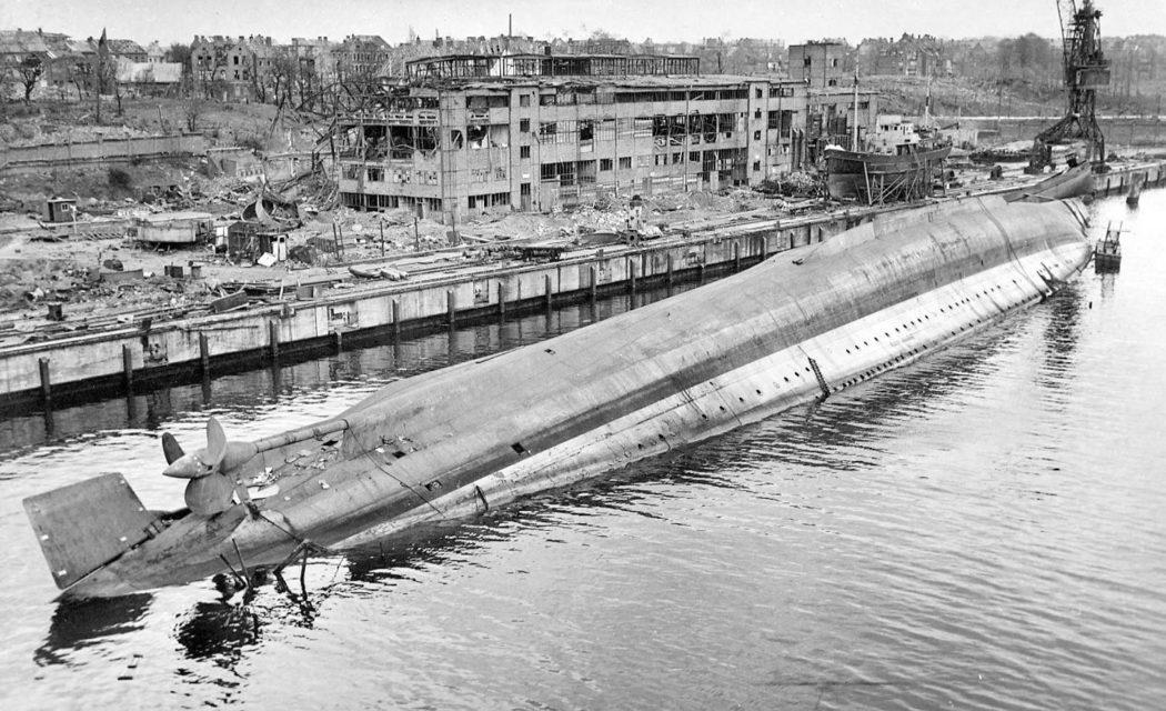 The capsized German heavy cruiser Admiral Scheer